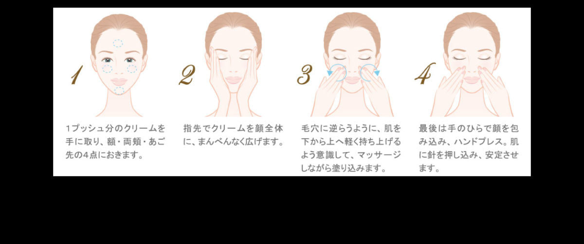 夜の洗顔後、化粧水や美容液などのスキンケアの最後にお使いください。(朝のご使用よりも、夜のスキンケアでお使い頂く方が効果的です。)