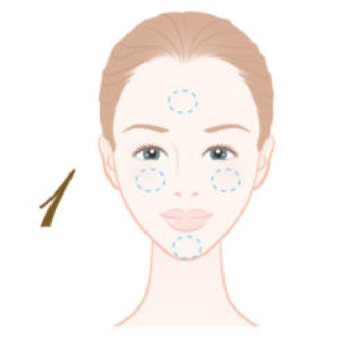 1.プッシュ分のクリームを手に取り、額・両頬・アゴ先の4点におきます。